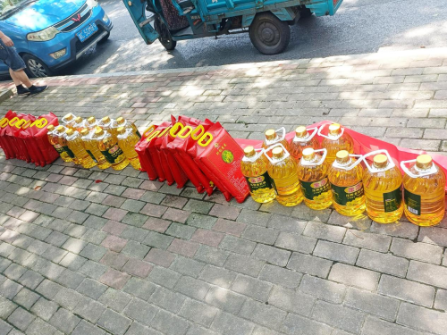 周九喜珠宝工作人员将大米和食用油等生活物资送到环卫工人手中。一份份粮油,送上的不仅仅是日常生活所需,更诉说着周九喜珠宝对这群“城市环境守护者”的尊重与心意。当他们接过礼物,笑容便驱散了辛劳,这质朴的回应,正是对这份心意最珍贵的回馈。